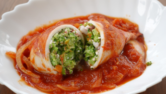 ④両面焼いたイカをトマトスソースを作ったフライパンに戻し、蓋をして弱火で10分煮る。